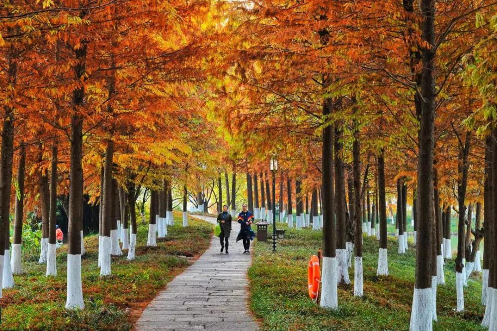 水杉在湘湖分布较多,沿着湖畔漫步,就可以和这片季节限定版风景撞个满怀。长存的绿、落叶的黄、杉林的红,各种颜色相互交织,在光影下婀娜挺立,与清澈的湖水交相辉映,美得不可思议。行走在杉间小道上,如同漫步在童话般色彩斑斓的世界。