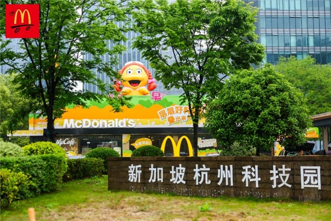 杭州新加坡科技园餐厅外立面变身为麦当劳大鸟姐姐得来速主题店