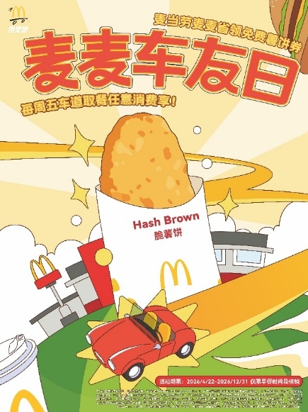 麦当劳得来速持续深耕早餐场景,优化产品与服务,推出车道专属优惠,让市民早高峰出行更高效、用餐更省心。“麦麦车友日”是基于车友早餐场景,面向麦当劳“得来速”用户打造的专属福利平台,旨在为麦当劳“得来速”用户带来专属权益和惊喜。活动一:自2026年4月22日起,顾客通过麦当劳点餐APP或者小程序等平台进入“麦麦省”页面领券后,每周五早餐时段在得来速车道取餐,任意消费即可核销免费薯饼一份;活动二:顾客下载麦当劳APP并绑定车牌号码,即可领取得来速车贴一张,数量有限,送完即止。