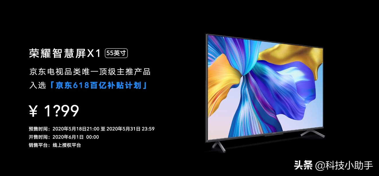 荣耀智慧屏X1 65吋3299元,今天21点开启预售,将于5月25日10:08在华为商城、京东、天猫、苏宁易购、亲选商城、荣耀体验店同步开售,首销优惠300元;荣耀智慧屏X155吋2299元,开售时间及平台尽情期待;荣耀智慧屏X1 50吋价格及开售时间和开售平台敬请期待;同时荣耀智慧屏X1 55吋成为京东618百亿补贴计划电视品类唯一顶级主推产品,今天21点开启预售,将于6月1日00:00在荣耀线上授权平台开售。